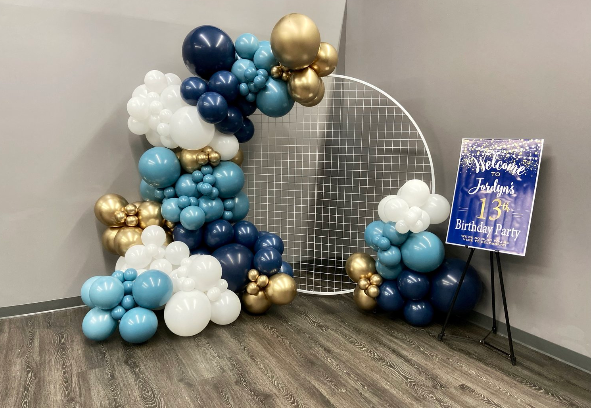 Welcome Sign with Cascading Balloons for Guest Entrance